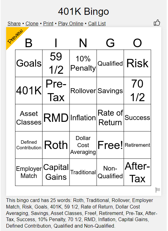 What better way to get excited about saving for your future than playing a round of 401(k) Bingo with your coworkers? Click here!